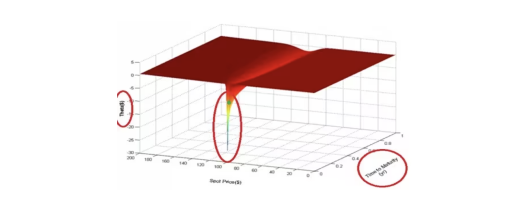 再看下面的第二张图,这是一张在不同时间段和不同协定价格的期权头寸Theta值的变化。图中可以看到在期权交易的最后几天,平值期权的时间价值Theta也是以几何级数的速度在不断地递减,一直到期权的最后交易时间,期权时间价值Theta归于零。
