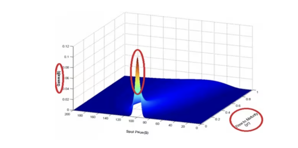 请看下面的第一张图,这是不同时间段和不同协定价格的期权头寸Gamma值。图中可以看到在接近期权到期日的前几天,平值期权的Gamma数值每日以几何级数增加,直到期权交易的最后一天(图中红色椭圆圈内)。