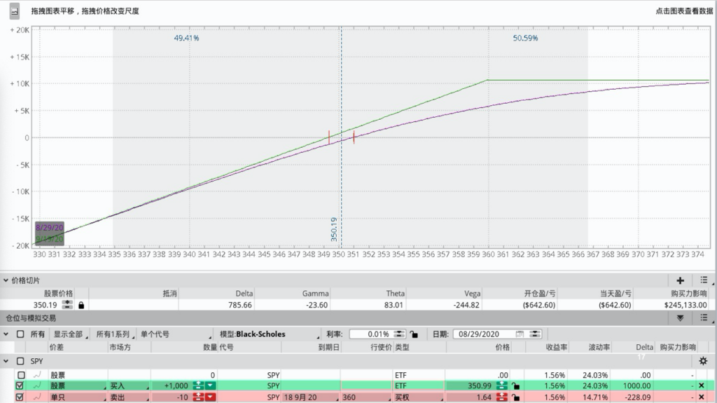 Covered call的盈亏是这样计算的,最大盈利是 (strike price-stock price)+option premium。假如购买股票的价格是350,同时covered call的行权价(strike)是360,获得的期权金(premium)是1.63,最大盈利就是(360-350)+1.63=11.63。盈亏点是(stock price-option premium),按照刚才的例子就是 350-1.63=348.37,也可以理解为成本价降低了。最大亏损取决于股票的跌幅,从理论上讲股票可以是零的,现实来看虽然不可能为零,但是跌幅过大也是很麻烦的。虽然这时候期权金(premium)都成为利润了,但是金额相比股票还是很小的,不足以抵消股票下跌的幅度。