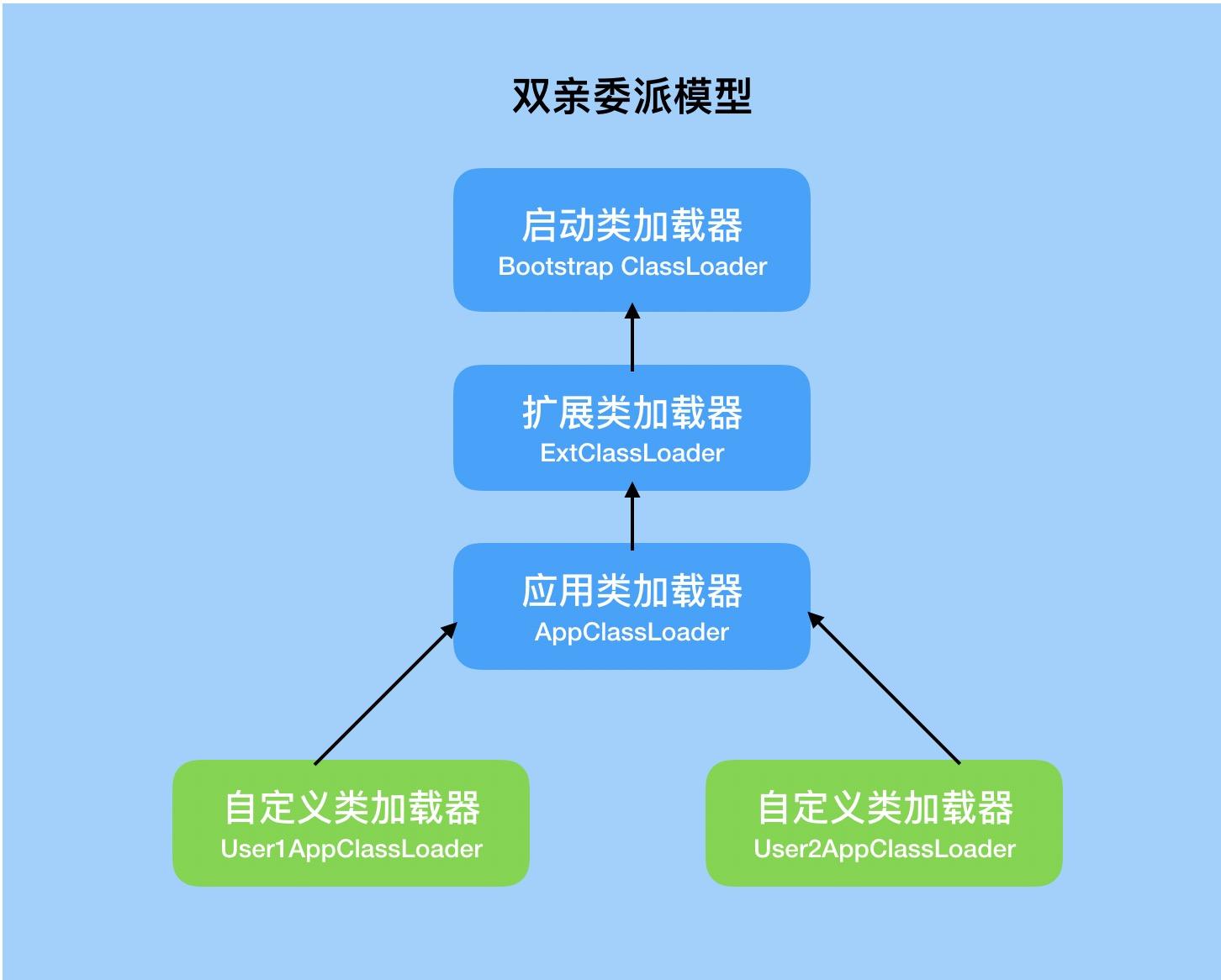 双亲委派:如果一个类加载器收到了加载某个类的请求,则该类加载器并不会去加载该类,而是把这个请求委派给父类加载器,每一个层次的类加载器都是如此,因此所有的类加载请求最终都会传送到顶端的启动类加载器;只有当父类加载器在其搜索范围内无法找到所需的类,并将该结果反馈给子类加载器,子类加载器会尝试去自己加载。