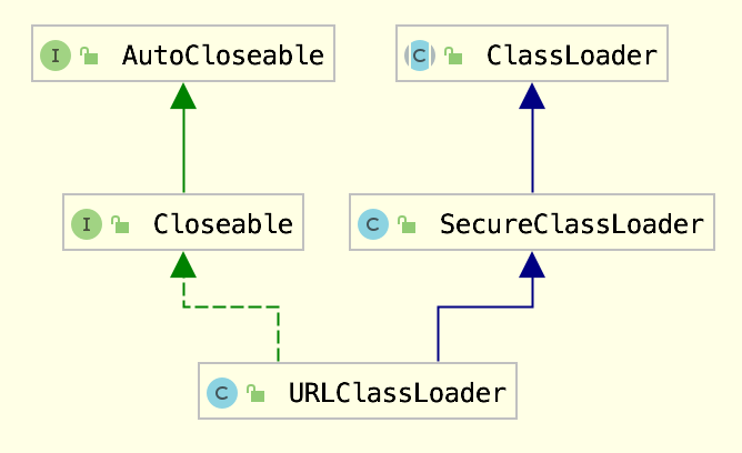 ExtClassLoader,AppClassLoder继承URLClassLoader,而URLClassLoader继承ClassLoader,BoopStrap ClassLoder不在上图中,因为它是由C/C++编写的,它本身是虚拟机的一部分,并不是一个java类。
