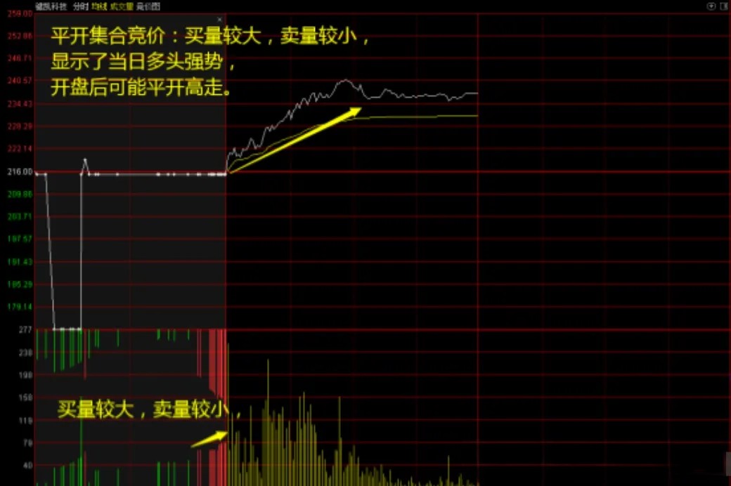 集合竞价分时的红绿柱表示成交量,但分为两层:上层表示没有匹配成交的量,其中红色表示集合竞价期间未成交的买单,绿色表示未成交的卖单;下层成交量表示虚拟撮合成交量,其中红色表示已撮合的主动性买入量,绿色表示已成交主动性卖出量。
