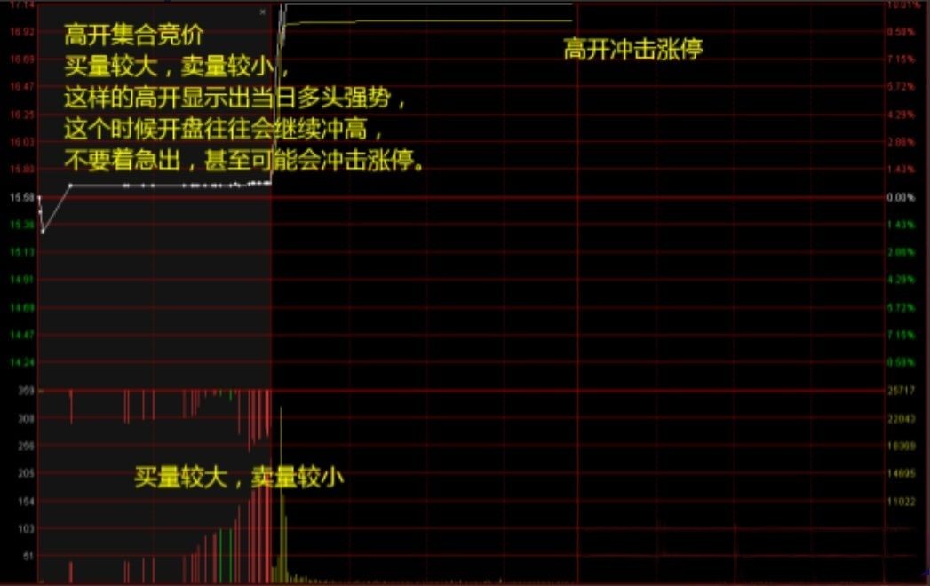 (1)进量较大,出量较小,这样的高开显示出当日多头强势,这个时候开盘往往会继续冲高,不要着急出,甚至可能会冲击涨停。