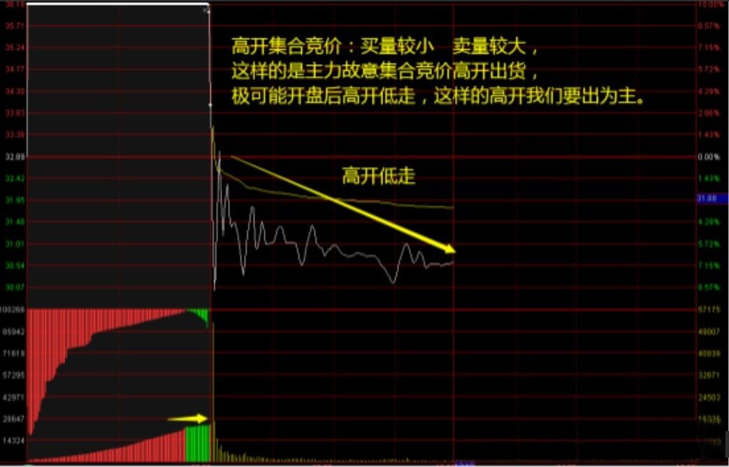 (2)进量较小 出量较大,这样的是主力故意集合竞价高开出货,极可能开盘后高开低走,这样的高开我们要出为主。