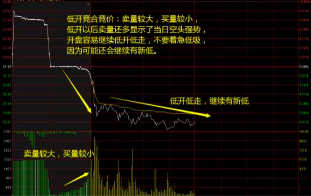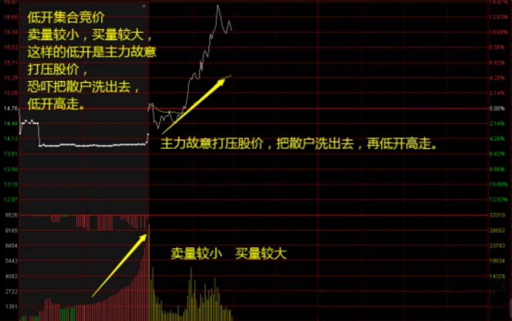 (2)出量较小 进量较大,这样的低开是主力故意打压股价,恐吓把散户洗出去,极可能低开高走。