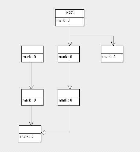 图示: 下图是程序运行期间所有对象的状态,它们的标志位全部是0(也就是未标记,以下默认0就是未标记,1为已标记)
