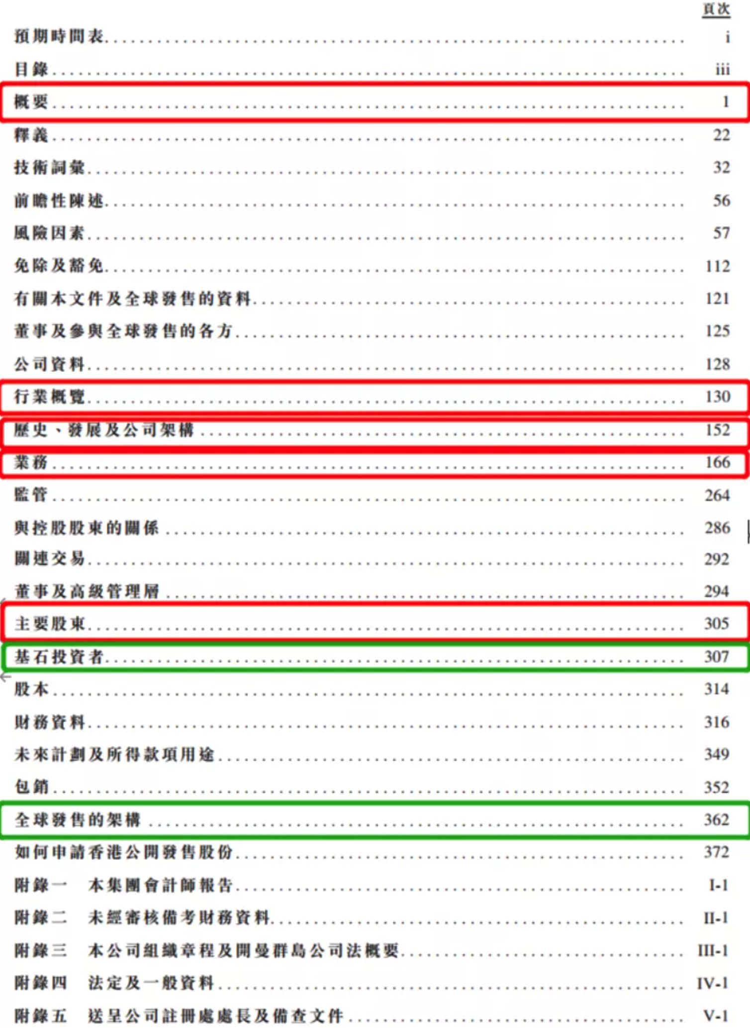 另外注意,招股书一般包含招股前版本和招股时的全球发售版本,全球发售版本较招股前版本会多出基石投资者、全球发售的构架等内容,即图中绿色标记部分。