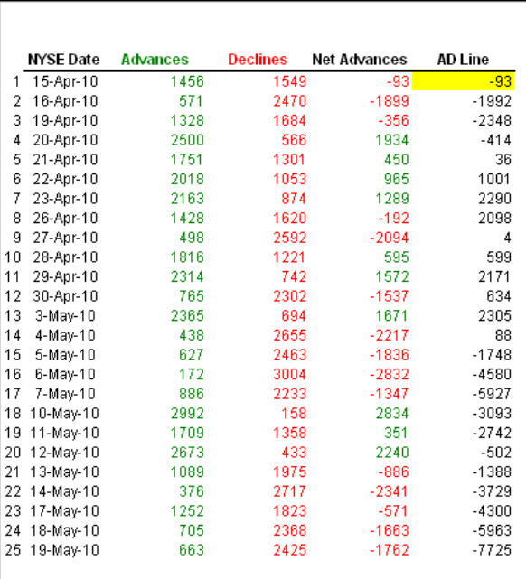 下面的表是个例子,每一行就是每一天的数据,第1列是日期,第2列是上涨数量,第3列是下跌数量,第4列是净值,第5列是AD值。
