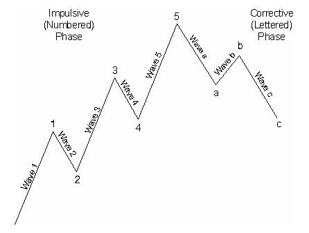 波浪理论认为,所有事物包括社会与经济都会以一系列相似且恒定的、有着明确的波浪数和模式的波浪重复演进向前。艾略特认为,一个完整的向上波浪运动由5个浪组成,其中3个(上升浪)将与运动同向,2个浪反方向运动,每个浪在行进时都处于两个平行直线之间的通道中。主要运动方向上的波浪(奇数浪),被命名为第1浪、第3浪和第5浪,调整浪(偶数浪)被命名为第2浪和第4浪,奇数浪可以细分成小一浪级的5个浪,偶数浪则只能细分成小一浪级的3个浪。一轮向上运动的5个浪等同于下一个更大运动的第1浪。波浪没有统一的长度或持续时间。