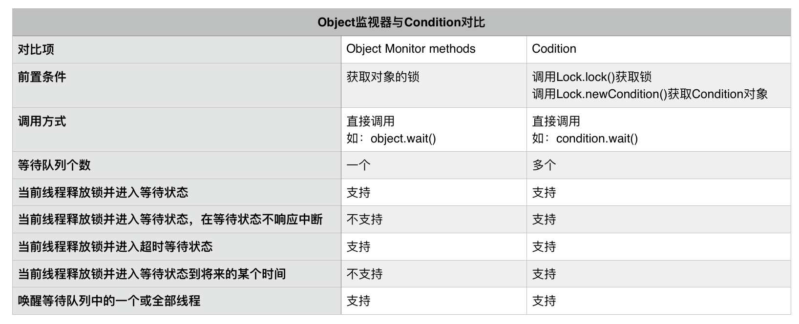 Condition接口也提供了与Object类似的监视器方法,与Lock配合可以实现等待通知模式,但是这两者在使用方式以及功能特性上还是有差别的。