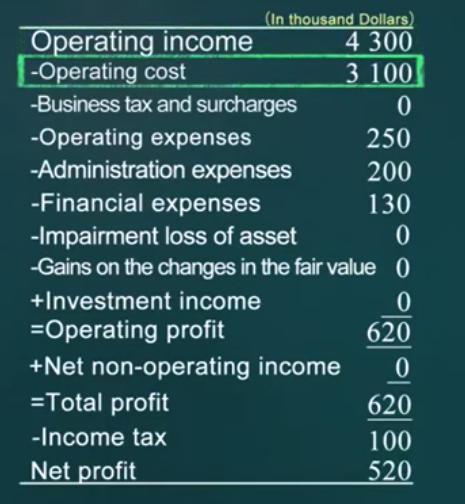 • 毛利-营业税金及附加-三项费用+投资收益-资产减值的损失-公允价值的变动的损失=营业利润 ,