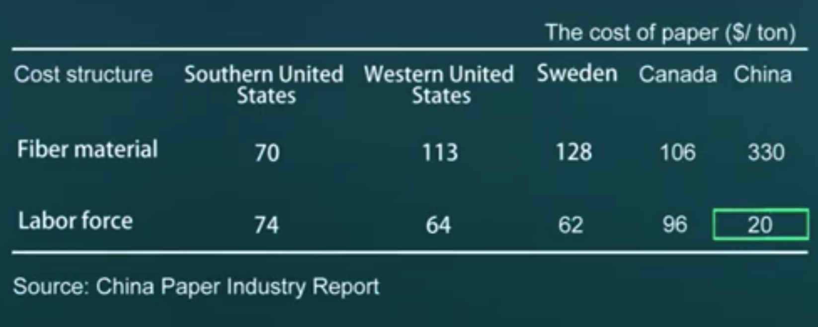 造纸行业,中国用人成本低、但是原材料成本高 A建设的原材料基地,成本很高,林场的树还是树苗?,还没发挥作用,非常大手笔 B采取的措施是替代原材料,采取别的就近原材料