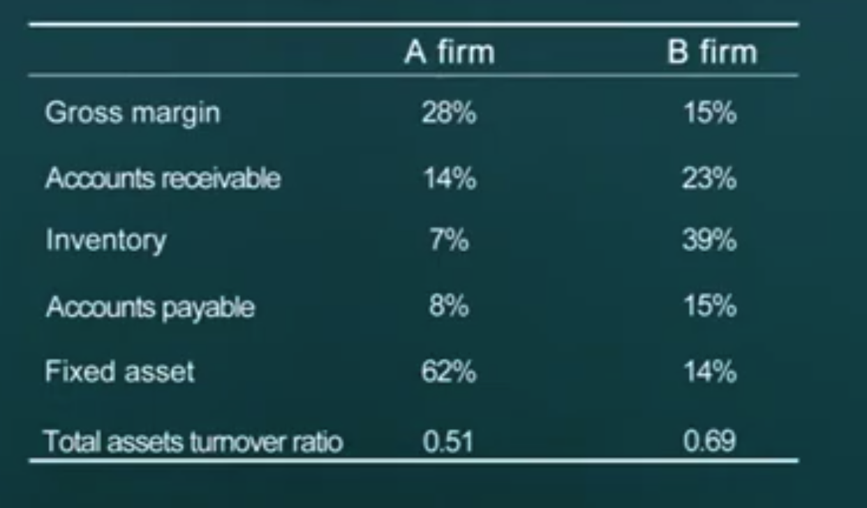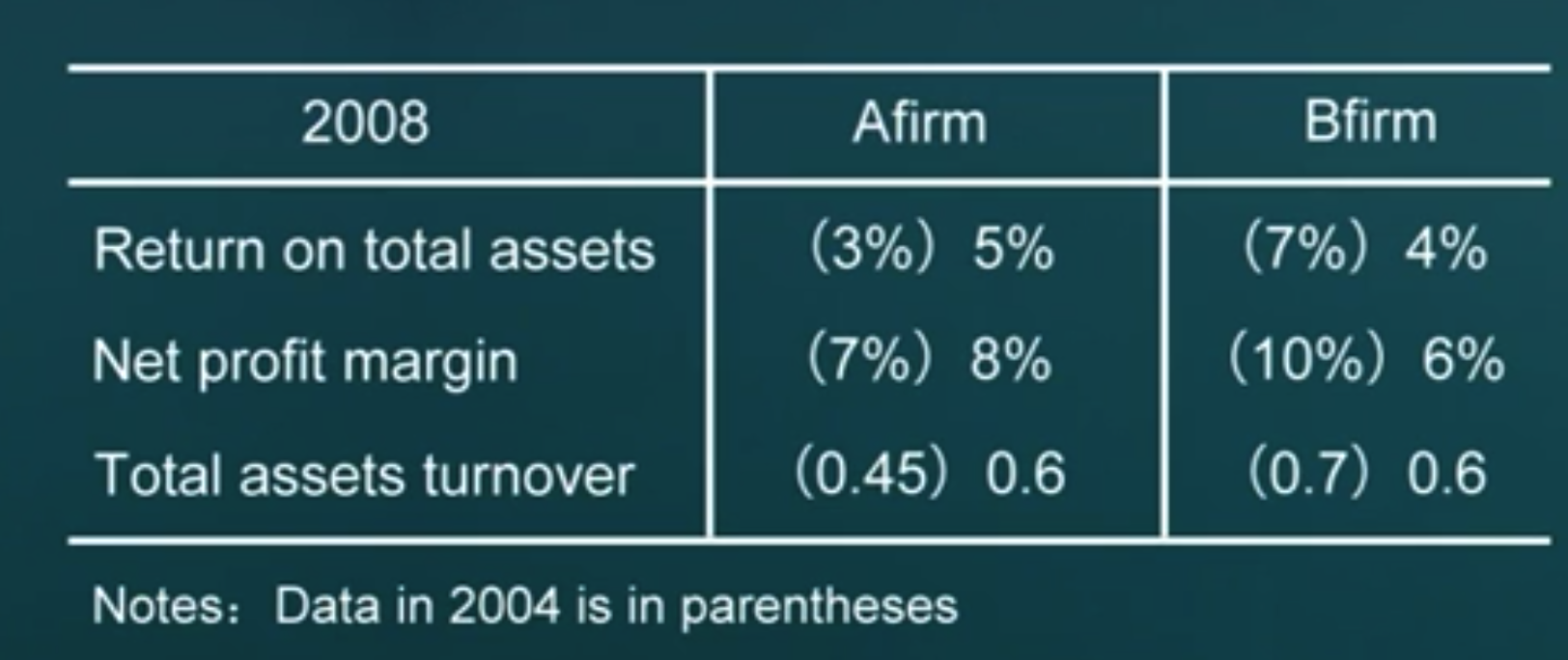 效率方面,A总资产周转率0.45,B 0.7 效益方面,A净利润率7%,B10%
